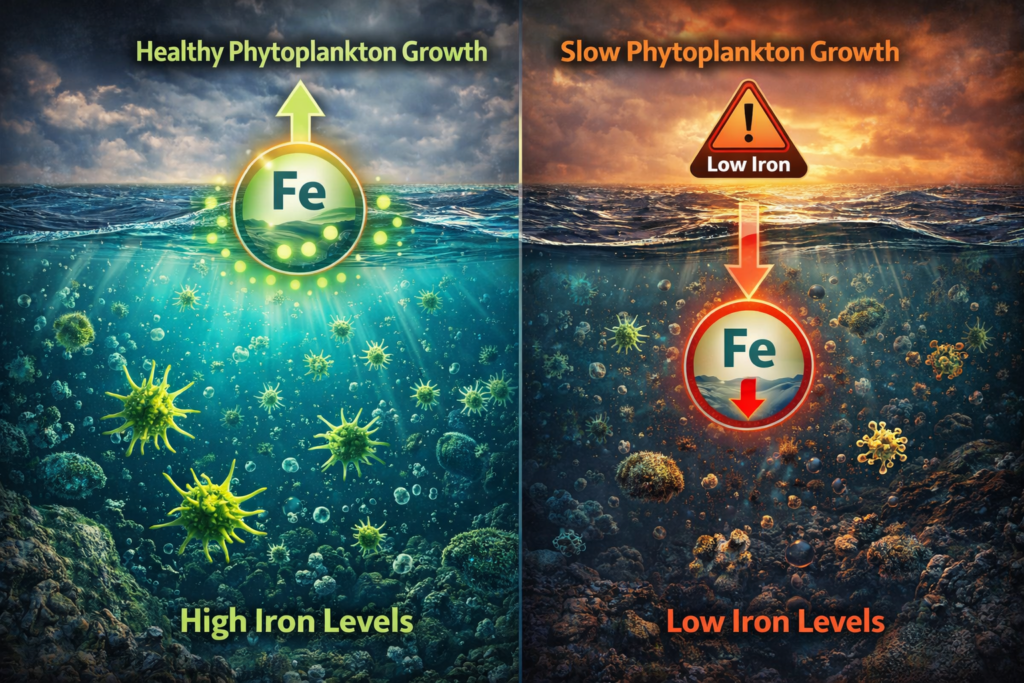 Additionally, reduced dust transport from land—one natural source of iron—may further limit iron supply in certain regions.