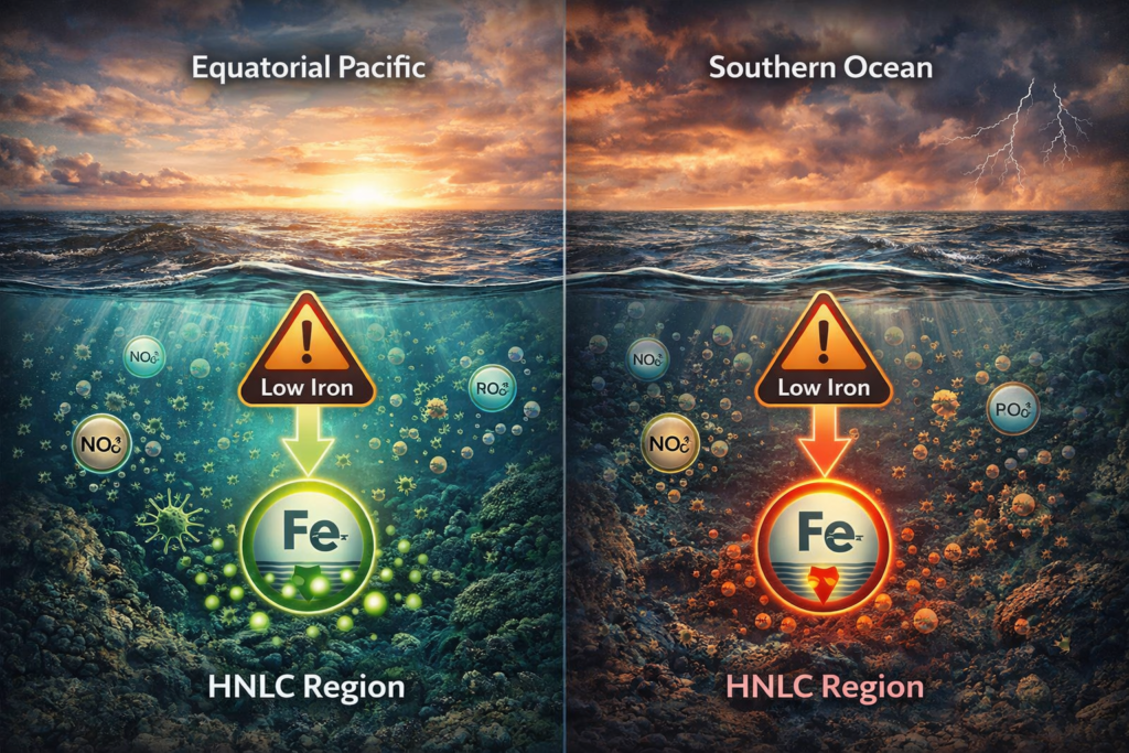 Regions like the Southern Ocean and parts of the Pacific Ocean experience natural iron limitations.